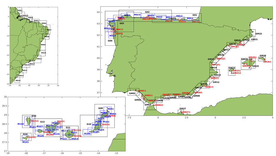 Figure 3.4. High resolution grid domains used to get DOW coastal waves in Spanish and Brazilian coast.