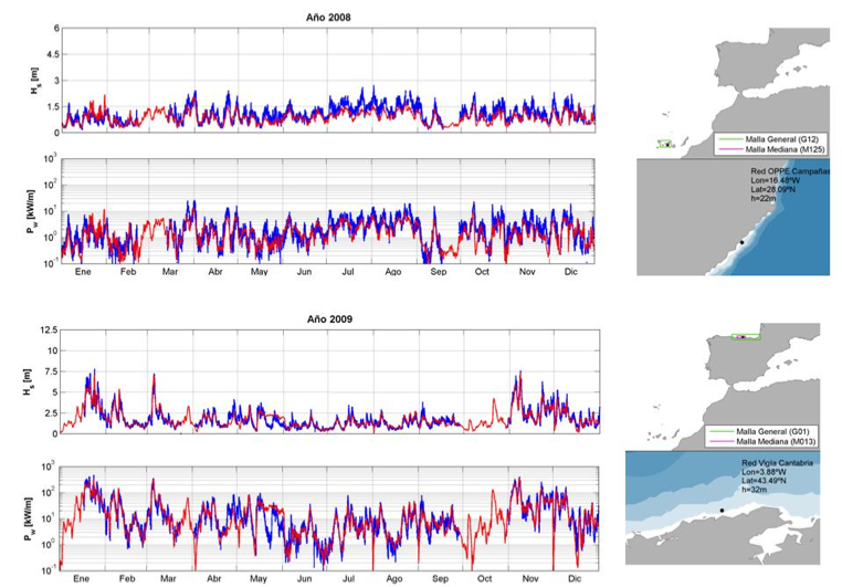 The ability to reproduce hourly time series of coastal waves has been validated by comparing DOW and buoy records. The results confirm that the proposed methodology is able to reproduce the time series of wave parameters at coastal areas, even for energy estimation (see figure 3.5.).